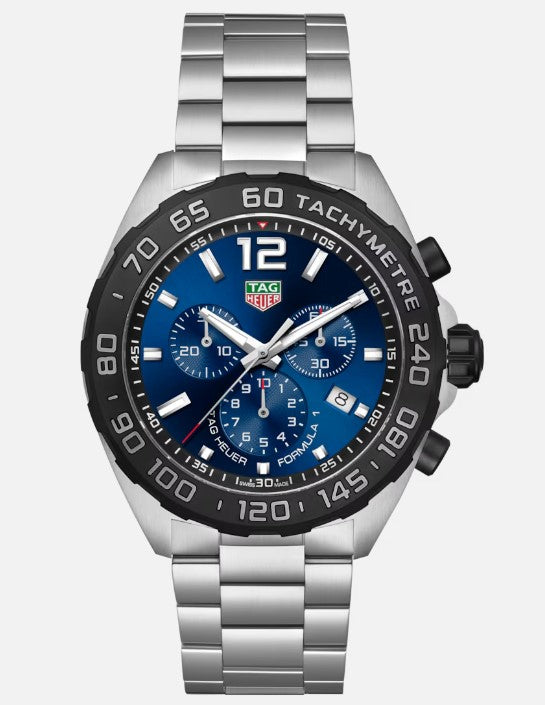 Striking the perfect blend of style and performance, this TAG Heuer Formula 1 chronograph is fit for every challenge. Combining a bold blue sunray brushed dial and a sleek steel bracelet, this 43MM timepiece revisits a classic racing icon with a modern twist.