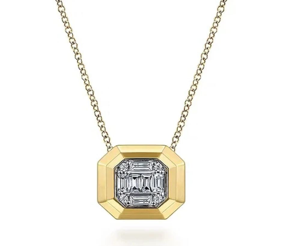 Yellow Gold Geometric Baguette and Round Diamond Pendant Necklace